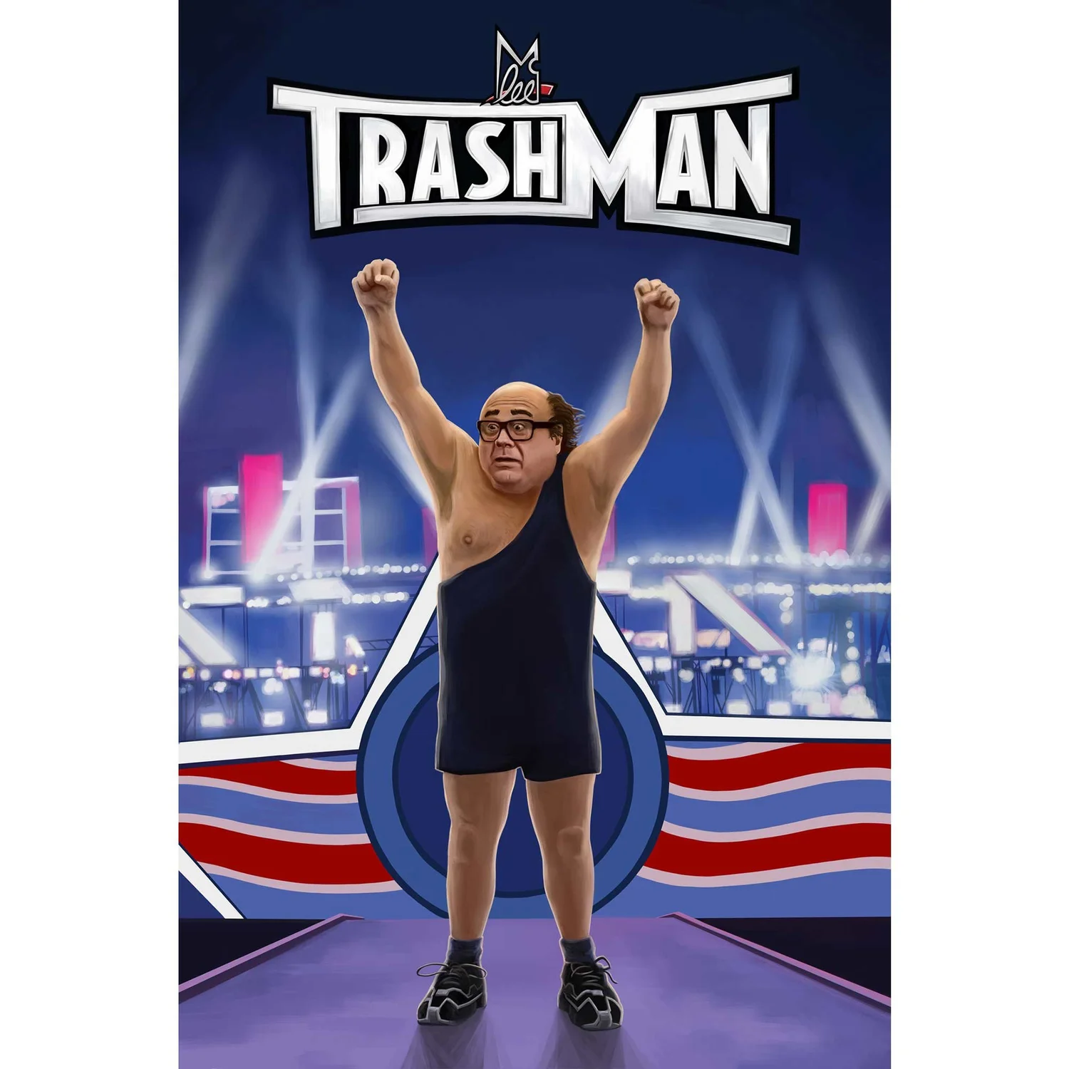 A fanart painting of the wonderful Danny Devito aka Frank Reynolds as The Trashman from the "Its Always Sunny in Philadelphia" episode "The Gang Wrestles for the Troops," painted in a Wrestlemania inspired poster style.